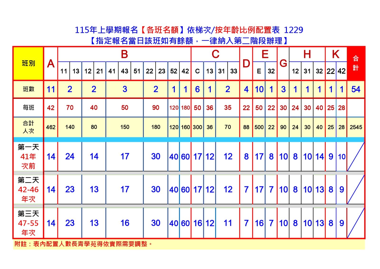 【各班名額】依梯次 / 按年齡比例配置